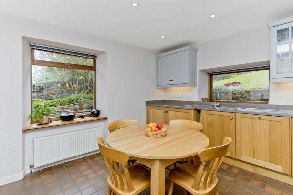 External steps (flanked by the leafy front garden) lead to the home’s main entrance, where you are welcomed inside by a spacious, practical entrance porch with stained-glass windows and traditional floor tiles, flowing through to a hall with built-in under-stair storage. Set side by side to the left of the hall are a living room and dining room, both enjoying classic, airy proportions and generous space for lounge and dining furniture configurations. The reception rooms both feature picture rails, cornicing, and striking fireplaces, and the front-facing living room incorporates an open Edinburgh Press and takes full advantage of the home’s elevated setting with far-reaching views across the river. The dining room affords access to a small internal hall (with storage and an external entrance) which leads to the kitchen, where space is provided for a further casual dining area. The bespoke kitchen is fitted with attractive wood cabinets and ample workspace, framed by neutral splashback tiling and integrated with a fridge/freezer, an oven, a combination microwave, a warming drawer, and a dishwasher. A freestanding washing machine is also included, and there is space for a tumble dryer. The ground floor is completed by a bathroom comprising a bathtub with an overhead shower and a glazed screen, and a WC-suite.